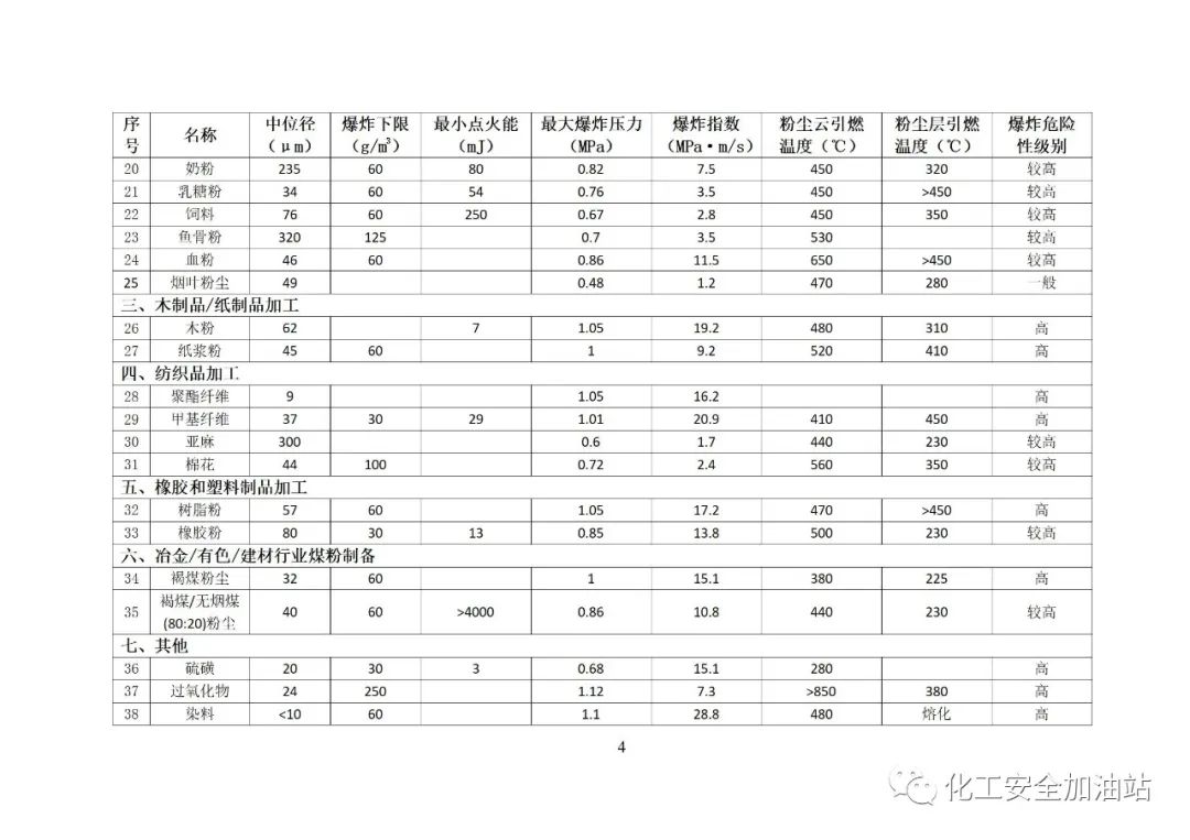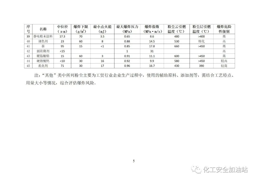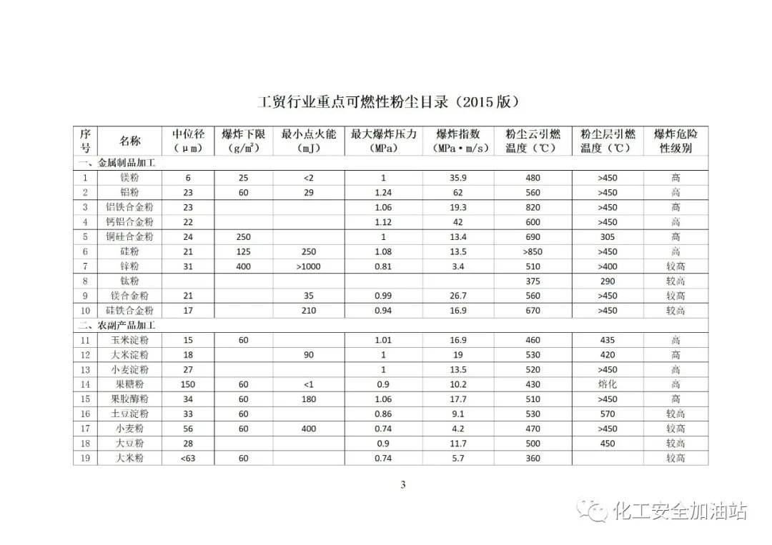 本目錄所列粉塵僅限于冶金、有色、建材、機(jī)械、輕工、紡織、煙草、商貿(mào)等行業(yè)企業(yè)生產(chǎn)加工所涉及的爆炸危險(xiǎn)性相對(duì)較高的可燃性粉塵。