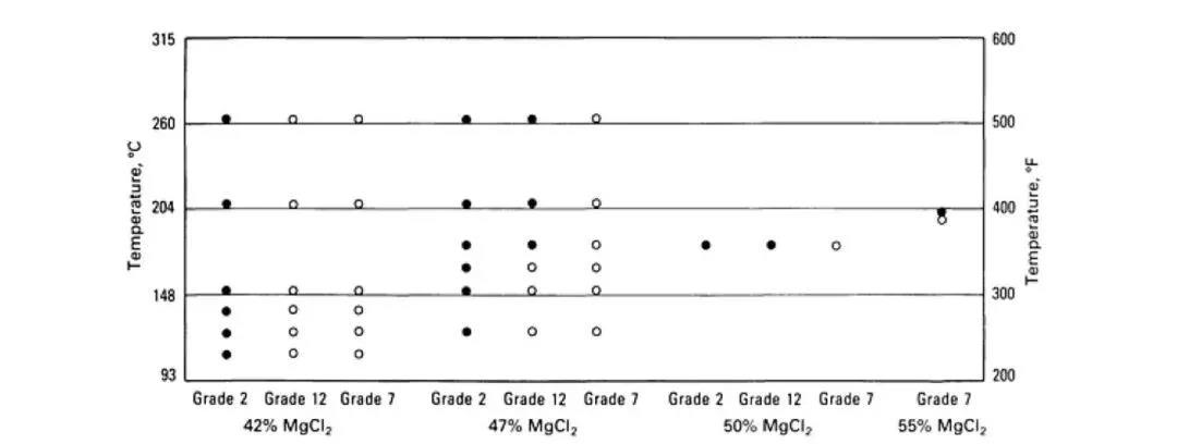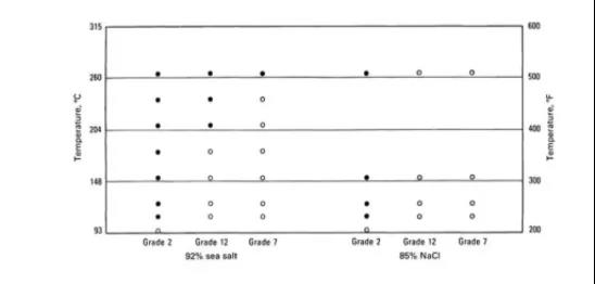 注意:圖中白色圓圈代表可以使用;黑色圓圈代表容易發(fā)生縫隙腐蝕或點(diǎn)蝕;白色三角形代表發(fā)生輕微的縫隙腐蝕,但是不影響使用。