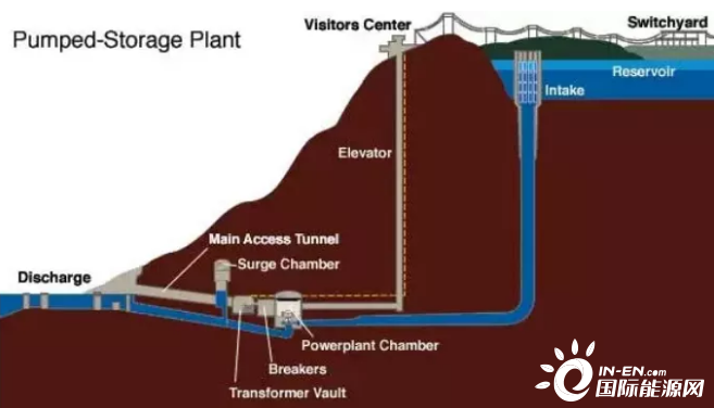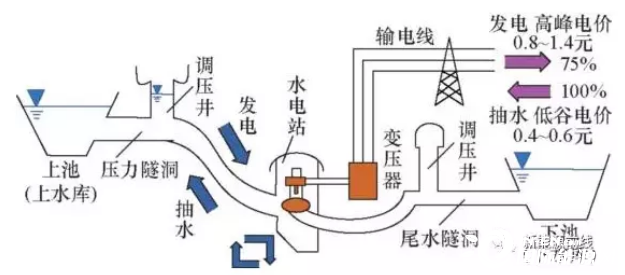 電網(wǎng)低谷時利用過剩電力將作為液態(tài)能量媒體的水從低標高的水庫抽到高標高的水庫,電網(wǎng)峰荷時高標高水庫中的水回流到下水庫推動水輪機發(fā)電機發(fā)電。
