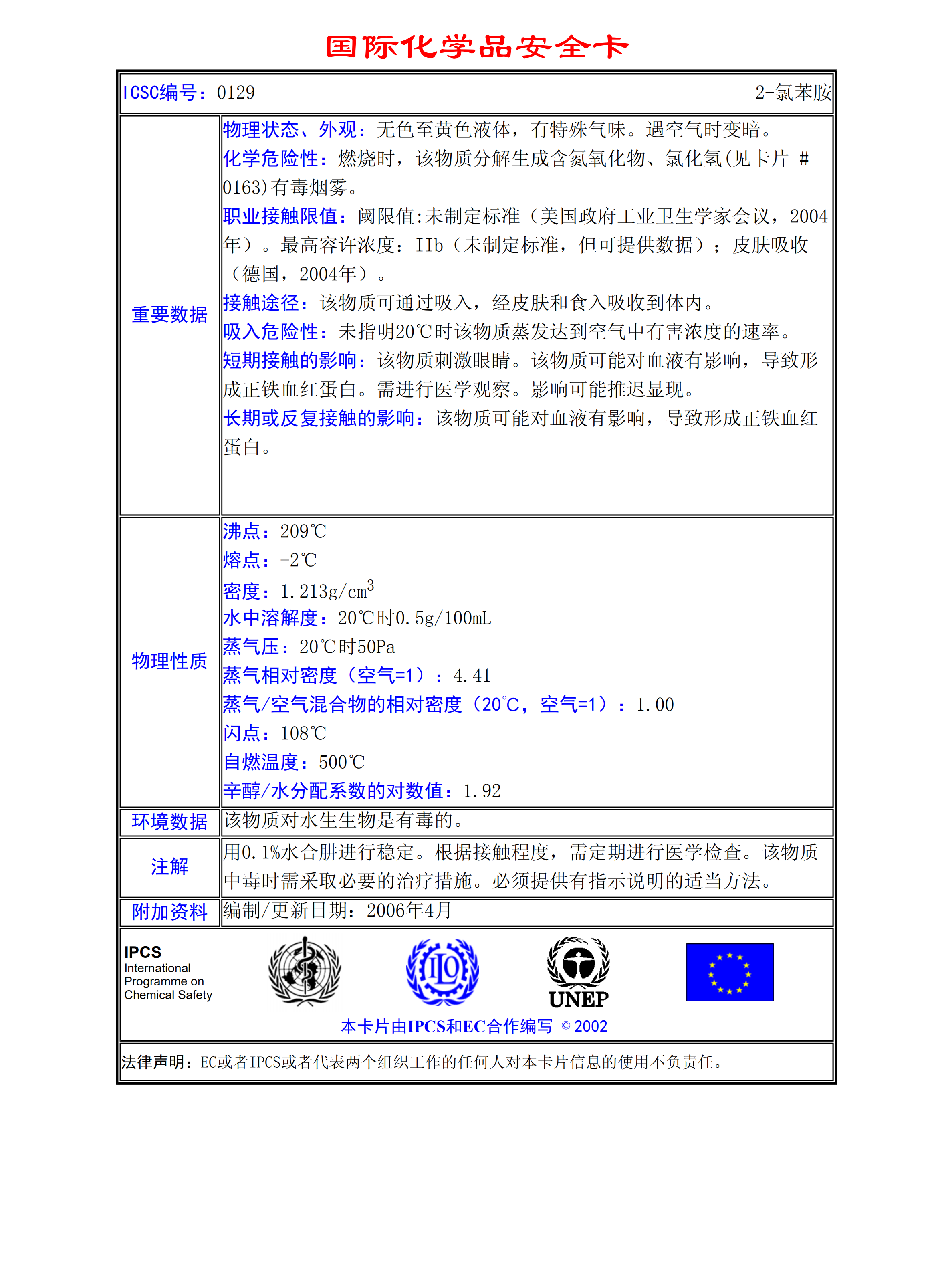 2-氯苯胺MSDS