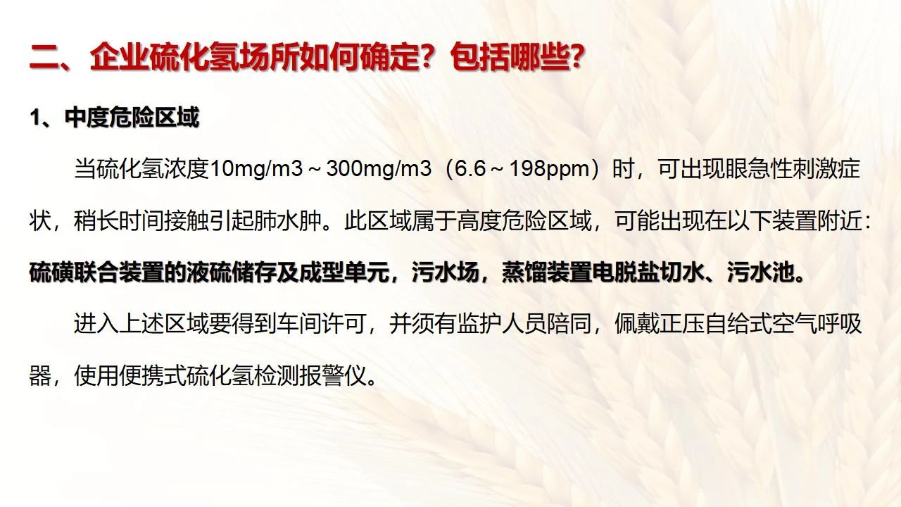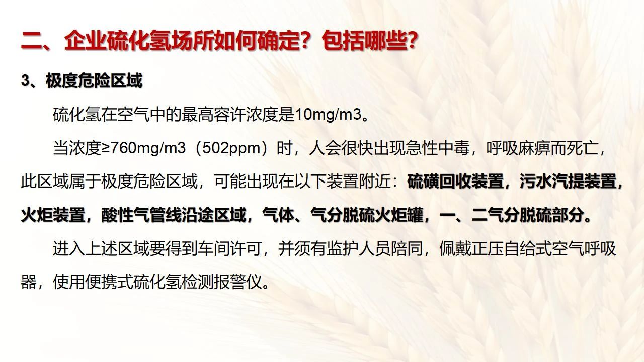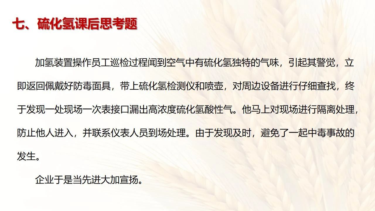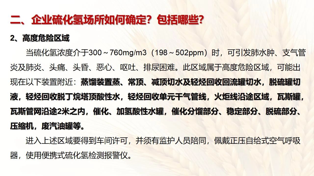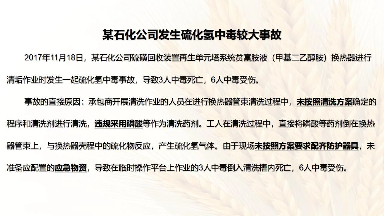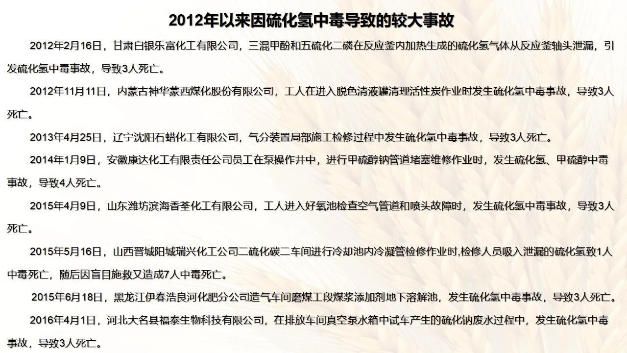 1預防措施 涉及硫化氫作業(yè)活動,必須嚴格遵守《化學品生產單位特殊作業(yè)安全規(guī)范》(GB 30871-2014)及相關的規(guī)范、標準、制度,并特別注意以下幾點: 1.產生硫化氫的生產設備應盡量密閉,并設置自動報警裝置(不能根據(jù)臭味來判斷危險場所硫化氫的濃度,硫化氫達到一定濃度時會導致嗅覺麻痹)。 2.對含有硫化氫的廢水、廢氣、廢渣,要進行凈化處理,達到排放標準后方可排放。 3.進入可能存在硫化氫的密閉容器、坑、窯、地溝等工作場所,應首先測定該場所硫化氫濃度,采取通風排毒措施,確認安全后方可操作。作業(yè)過程中應連續(xù)測定硫化氫濃度。 4.操作時做好個人防護措施,配好防毒用具(防毒面具一般為逃生自救用),作業(yè)工人腰間縛以救護帶或繩子。做好互保,要2人以上人員在場。 5.患有肝炎、腎病、氣管炎的人員不得從事接觸硫化氫作業(yè)。 6.加強員工有關專業(yè)安全知識技能的培訓,提高自我防護意識和能力。 2作業(yè)有關注意事項 (1)檢查采樣器是否完好,采用密閉取樣; (2)佩戴便攜式有毒有害(硫化氫)氣體檢測儀、適用的防毒用具,站在上風向,并有專人監(jiān)護; (3)采樣過程中手閥應慢慢打開,不要用扳手敲打閥門。 (1)佩戴便攜式有毒有害(硫化氫)氣體檢測儀、適用的防毒用具,站在上風向,并有專人監(jiān)護; (2)切水閥與切水口應有一定距離; (3)脫出的酸性氣要用氫氧化鈣或氫氧化鈉溶液中和,并有隔離措施,防止過路行人中毒; (4)切水過程中人不能離開現(xiàn)場。 需進入設備、容器進行檢修,應經過加盲板、吹掃、置換、采樣分析合格、辦理進設備容器安全作業(yè)票后,才能進入作業(yè)。但有些設備容器在檢修前,需進人排除殘余的油泥、余渣,清理過程中會散發(fā)出硫化氫和油氣等有毒有害氣體,必須做好安全措施。以下七項為設備內檢修作業(yè)步驟: (1)制定施工方案; (2)作業(yè)人員經過安全技術培訓; (3)進設備容器作業(yè)前,必須作好氣體采樣分析; (4)辦理進入受限空間安全作業(yè)票; (5)佩戴防毒用具(空呼等),攜帶好安全帶(繩); (6)作業(yè)時間不宜過長,一般不超過30min; (7)施工過程須有專人監(jiān)護,必要時應有醫(yī)務人員在場。 (1)執(zhí)行進入受限空間作業(yè)安全防護規(guī)定; (2)控制各種物料的切水排凝進入下水道; (3)采用強制通風或自然通風,保證氧含量為18%-21%,在富氧環(huán)境下不應大于23.5%; (4)配帶防毒用具(空呼等); (5)攜帶好安全帶(繩); (6)進入下水道內作業(yè)井下要設專人監(jiān)護,并與地面保持密切聯(lián)系。 (1)下油池清理前,必須用泵把污油、污水抽干凈,用高壓水沖洗置換; (2)采樣分析,根據(jù)測定結果確定施工方案和安全措施,辦理好進入受限空間作業(yè)票。 (3)配備防毒用具(空呼等),有專人監(jiān)護,必要時要攜好安全帶(繩); 設備、容器、管線存有硫化氫物料的堵漏、拆卸或安裝作業(yè)時,必須做到: (1)嚴格控制帶壓作業(yè),應把與其設備容器相通的閥門關死,安裝盲板,撤掉余壓;辦理相應安全作業(yè)票; (2)佩戴適用的防毒用具(空呼等),有專人監(jiān)護; (3)拆卸法蘭螺絲時,在松動之前,不要把螺絲全部拆開,嚴防有毒氣體大量沖出。 (1)平穩(wěn)操作,嚴防跑、冒、滴、漏; (2)裝置易泄漏或氣體易積聚的位置應安裝固定式硫化氫檢測報警器; (3)加強機泵設備的維護管理,減少泄漏; (4)可能有泄漏的地方加強通風; (5)涉及硫化氫物料的容器、管線、閥門等要定期檢查更換; (6)發(fā)現(xiàn)硫化氫濃度高,要先報告,采取一定防護措施后,才能進入現(xiàn)場檢查和處理。 (1)嚴禁在進、出油及調合過程中進行人工檢尺、測溫及拆裝安全附件等作業(yè); (2)必要的檢查、切水,操作人員應佩戴便攜式有毒有害(硫化氫)氣體檢測儀,站在上風向,并有專人監(jiān)護; (3)準備好適合的防毒面具,以便急用。 涉及有可能存在產生(逸出、外泄)硫化氫或者殘存硫化氫的清洗作業(yè)時,應事先進行風險辨識分析,并結合分析結果采取安全措施。