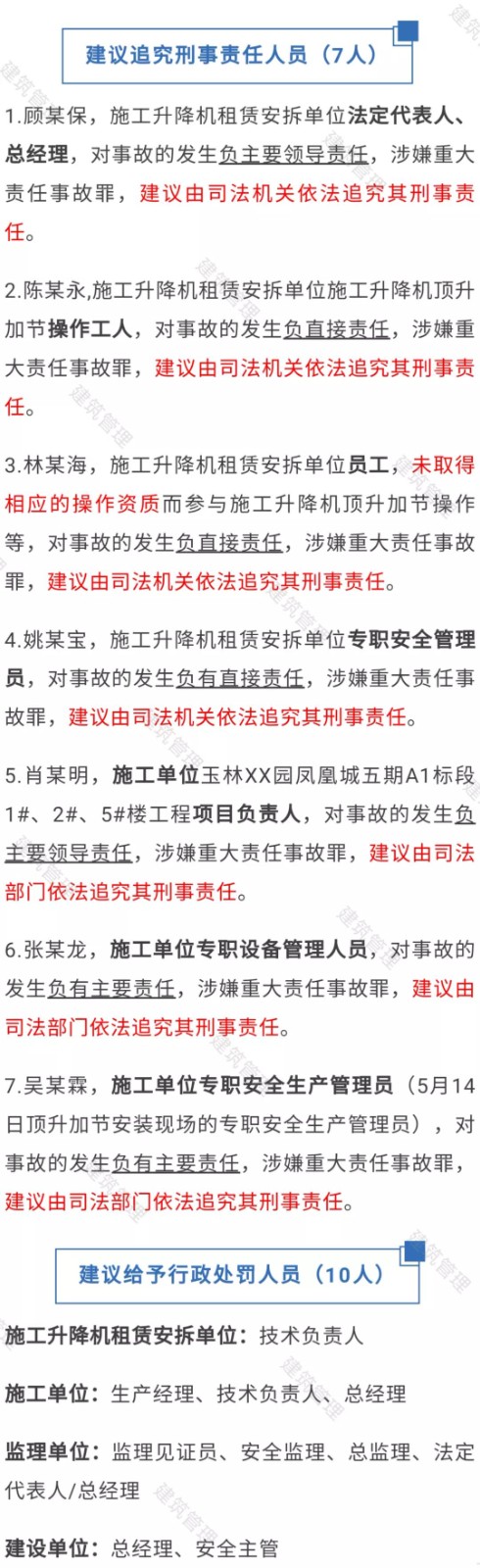 玉林升降機墜落致6人死亡!項目負責(zé)人安全員等7人被追刑責(zé)!10人被處罰!調(diào)查報告公布