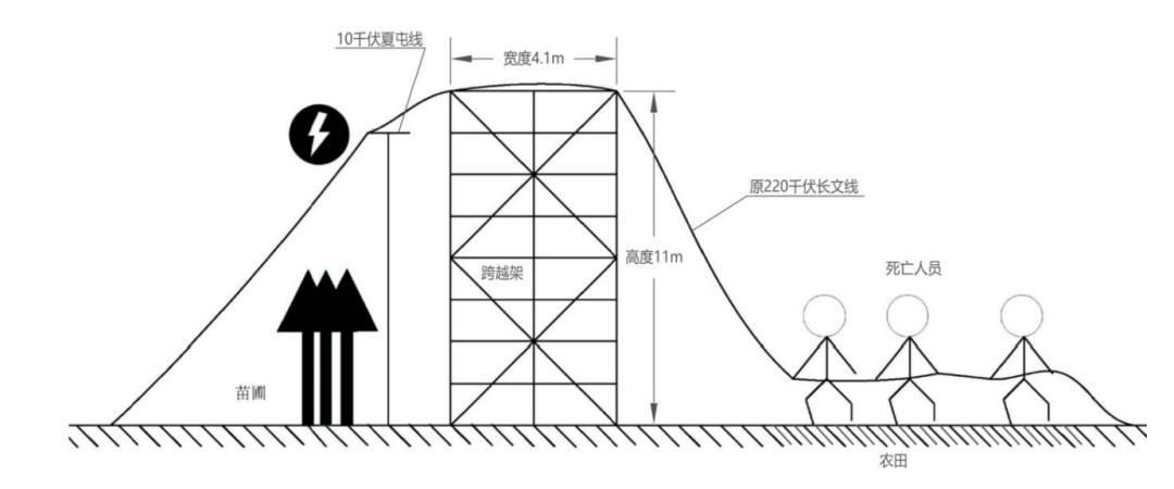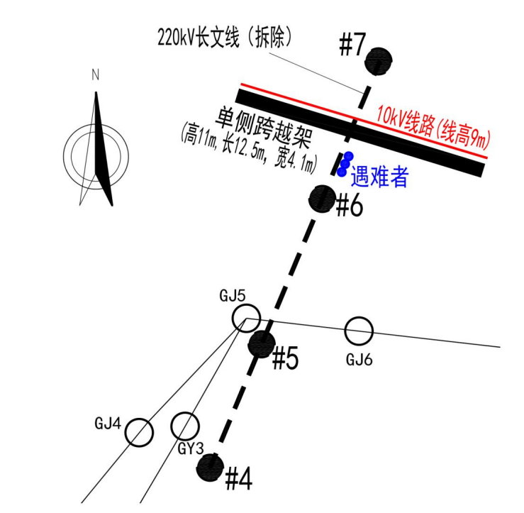 2023 年5月8日,施工項目部安排施工人員在原 220 千伏長文線 6-7 號桿塔間進行10千伏夏屯線跨越架搭設,因民事阻工僅在事故發(fā)生處南側搭設了單側跨越架。