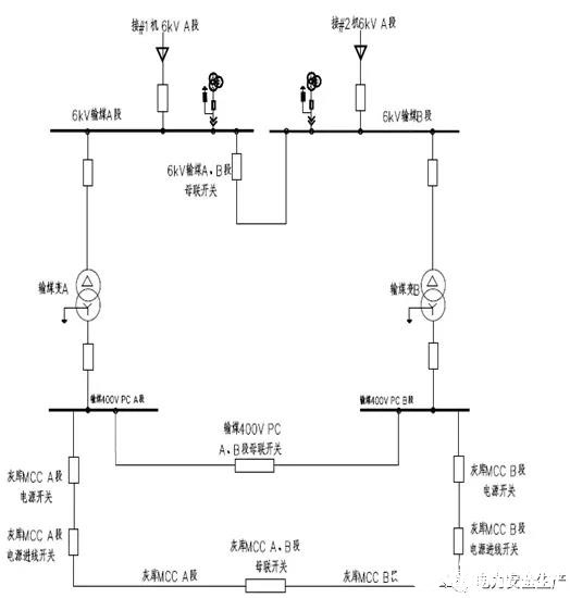 輸煤系統(tǒng)6kV電源設計A、B兩段母線,單母線分段運行,母聯(lián)開關熱備用。輸煤配電室內布置兩臺400V輸煤廠用變壓器,高壓側分別接6kV電源母線A段、B段,低壓側接輸煤400V母線A段、B段,兩段分段運行,母聯(lián)開關熱備用。