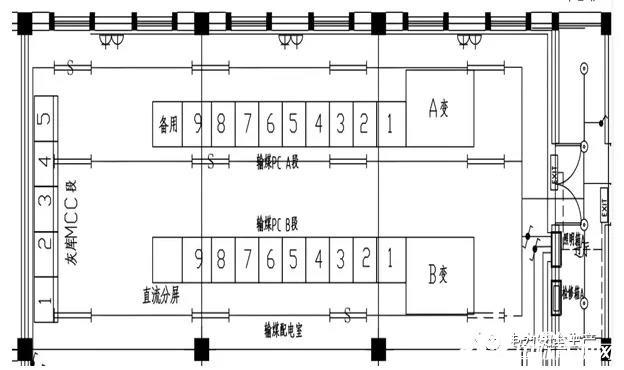 在輸煤配電室內,同時設計布置灰?guī)霢、B兩段MCC。兩段MCC各帶一個浪涌保護器,分別設置在兩段MCC進線開關側。400V灰?guī)霱CC開關柜為MNS型開關柜。灰?guī)斓裙孟到y(tǒng)的建設為A標段的工作內容,天津公司負責灰?guī)霱CC安裝,天津公司分包給中某建設實施。輸煤系統(tǒng)和灰?guī)祀娫唇泳€圖見圖一;配電室俯視示意圖見圖二。