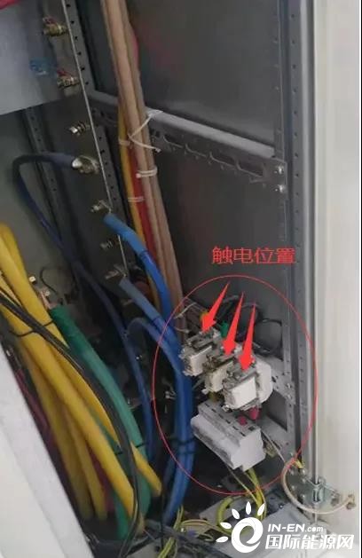 8月28日8點22分,王某帥(戴絕緣手套)完成本人負責的間隔電纜穿線并固定后,聽到隔壁柜發(fā)出聲響,檢查發(fā)現(xiàn)耿某坡(穿短袖上衣、未佩戴絕緣手套)身體倒進灰?guī)霢段MCC柜01間隔,右臂肘部及上臂與該柜浪涌保護熔斷式保險上插頭(裸露)三相搭接(現(xiàn)場照片見圖三)。王某帥立即通過拖拽耿某坡鞋子將其拉出間隔,并告知現(xiàn)場保安撥打120急救電話,同時進行不間斷心肺復蘇,通知本隊伍經(jīng)理霍某平。