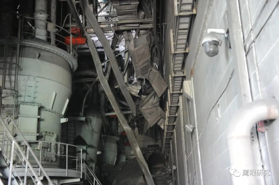 現(xiàn)場檢查,#2爐2D原煤倉下部錐體部脫落,砸壞2D給煤機平臺,連同給煤機墜落至#2鍋爐零米,2D給煤機損壞、2C、2D磨煤機油站、2D磨煤機、給煤機附近區(qū)域電纜、輔汽聯(lián)箱管道等設(shè)備不同程度受損,無人員傷害及主設(shè)備損壞。(堵煤次數(shù)太多,敲塌了?)